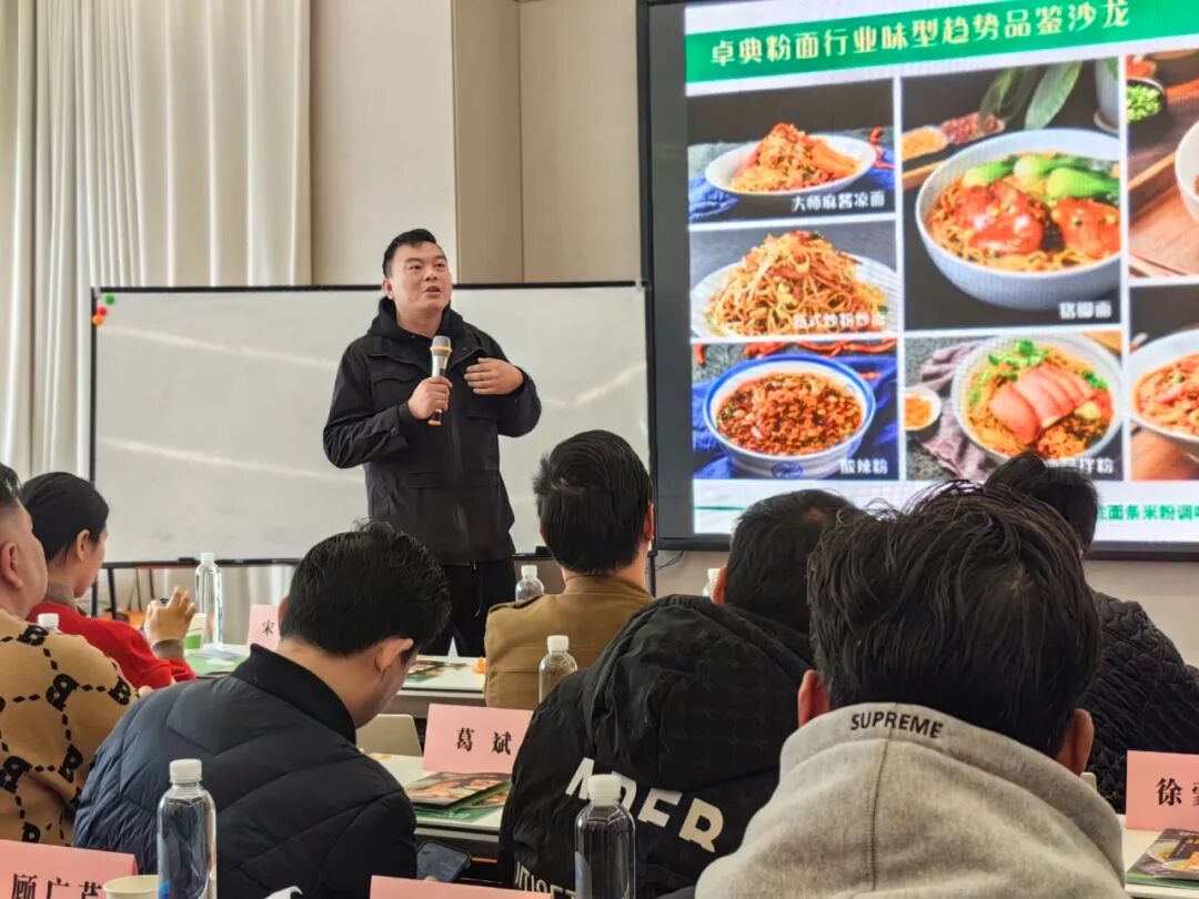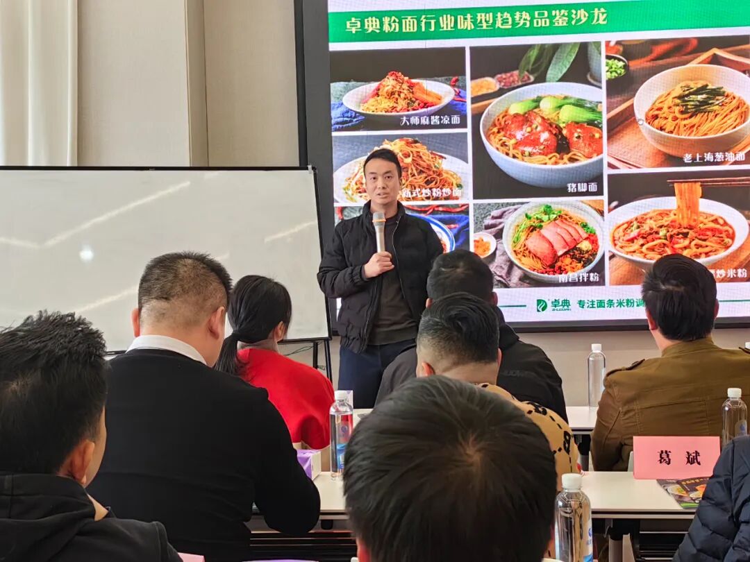 2/5 卓典创始人杨总与大家分享了对于中国粉面味道的执着追求,寻味的感受及认知;从“关于调味原厂地的一些事”展开讨论,讲述了寻味背后的文化故事,粉面的产地、地理环境、气候土壤、品种及原材料产地等一系列知识;从中国原料的悠久历史、调味料的发酵工艺,用生动有趣的语言带大家走进卓典味道-从了解味道,品尝味道到评价味道,用渊博的学识带大家深入了解卓典味道。 3/5 客户围绕与卓典的合作、产品、经验等分享交流。 ↑ 按住图片可左右滑动 4/5 卓典为在场来宾们准备了卓典爆款老上海葱油面、新品猪脚面、卓典经典款酸辣粉等,通过产品的品鉴,让大家感到了卓典味道的独特魅力。
